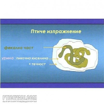 Урина кристали - белезникави до жълти. Водниста компонента - прозрачна, безцветна. Изгледа, консистенцията и цвета зависят от различни обстоятелства. При здравите птици фекалната маса зависи от вида, времето на отделяне, храната, количеството поета вода и физиологичното състояние на птицата.
